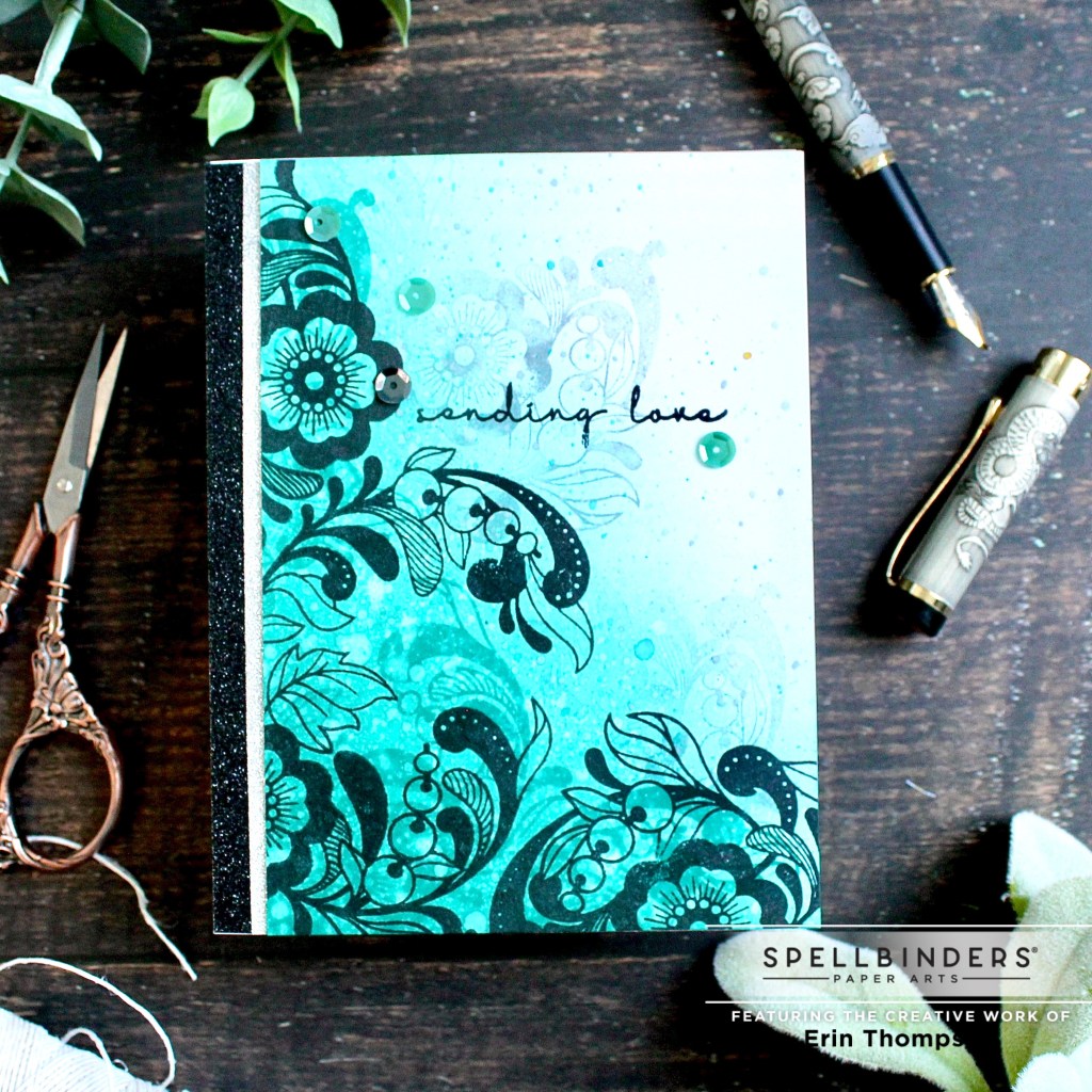 I dried the background before inking and stamping the focal images and sentiment in VersaFine ink. I added sequins, cut the panel down, and added glittery washi to the left edge of the card base before adhering the stamped cardstock.