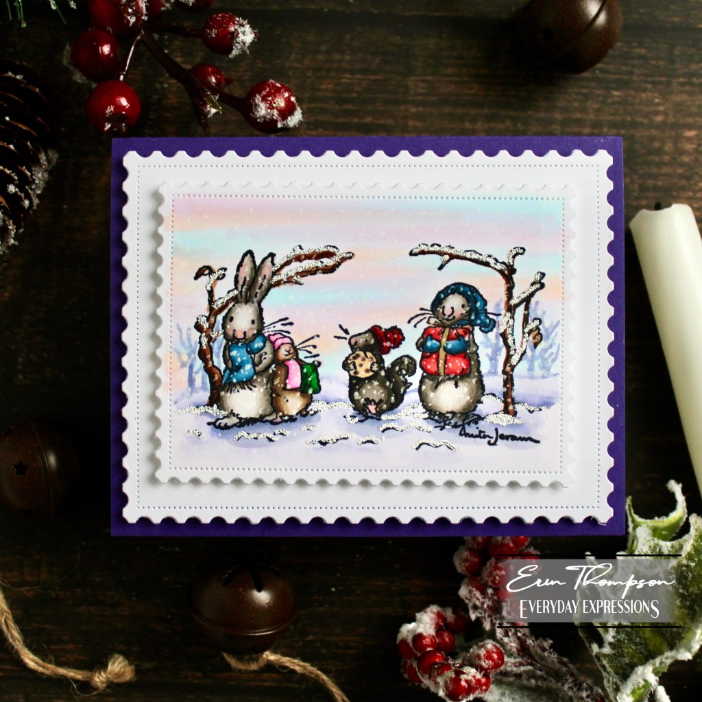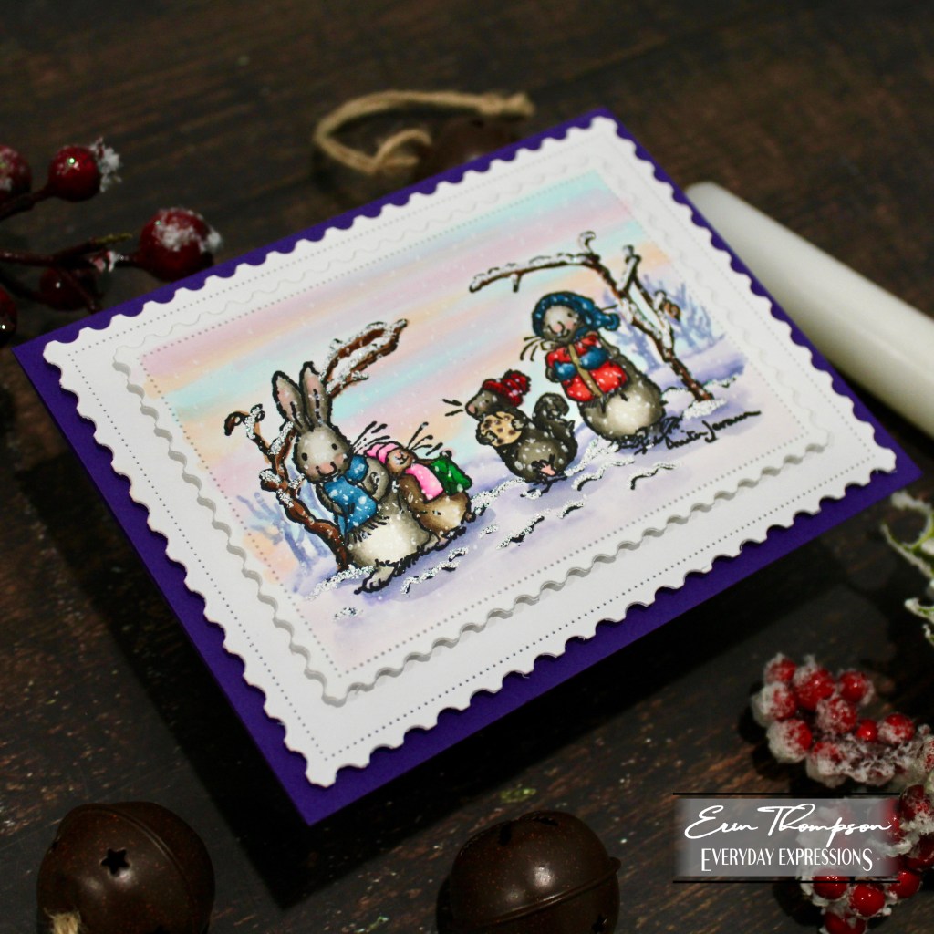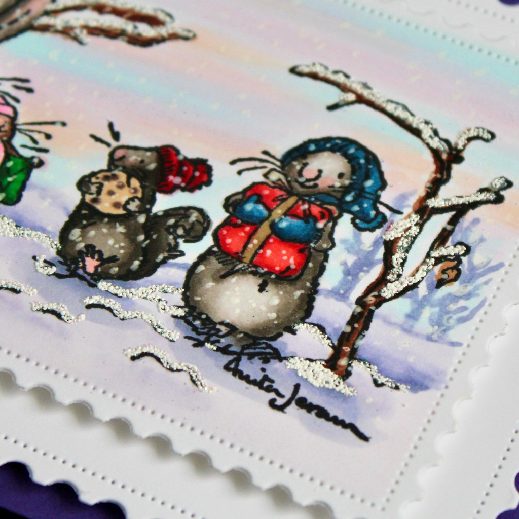 Cute critters, a snowy winter day and a rainbow! This is pure magic! I love your coloring and the sweet snowy scene – and the scallo0p edge is pure perfection! TFS!