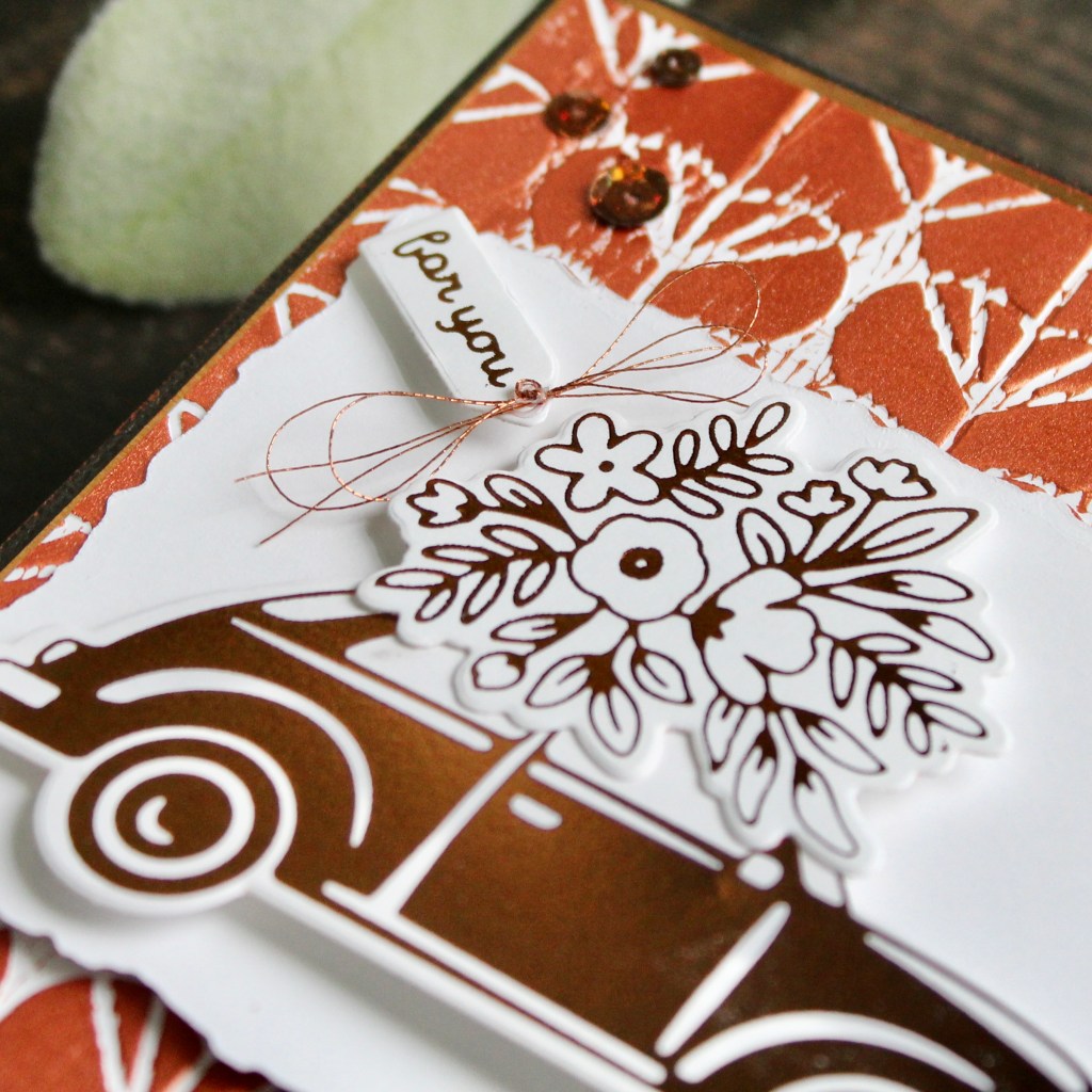 This card was so simple, but so fun to create! I began by foiling the Spellbinders’ Paper Arts Glimmer of the Month Club pieces in copper foil, and then cut them out with the coordinating dies. Do you see that gorgeous shine in the above picture? Ooh la la!!