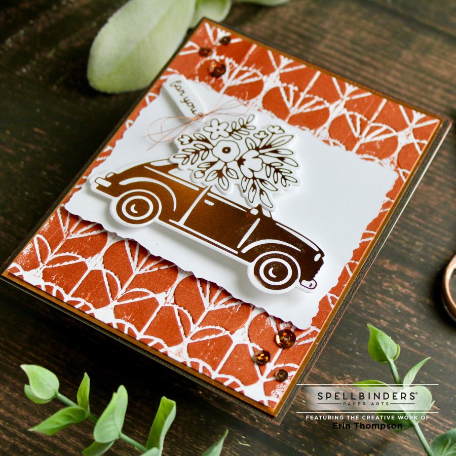 This card was so simple, but so fun to create! I began by foiling the Spellbinders’ Paper Arts Glimmer of the Month Club pieces in copper foil, and then cut them out with the coordinating dies. Do you see that gorgeous shine in the above picture? Ooh la la!!