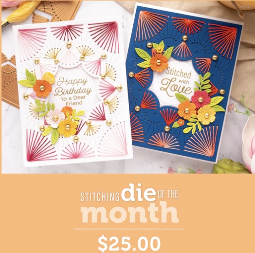 Don’t you think the stitching with layered dies is absolutely stunning? This lovely set is from the new Spellbinders’ Paper Arts Stitched Club of the Month. Unfortunately this sold out very quickly, and thus why I didn’t share this card sooner. If you think you would like to try joining next month, I recommend joining on the first of February.