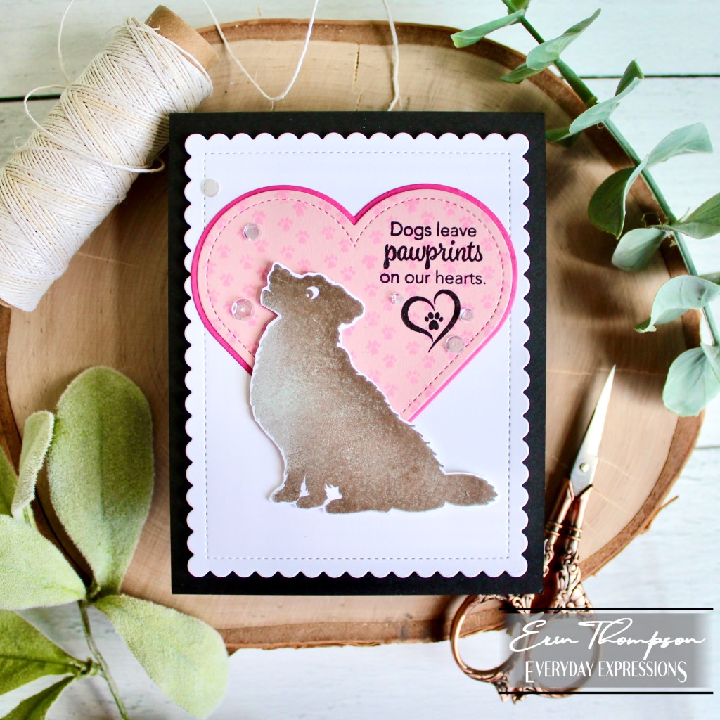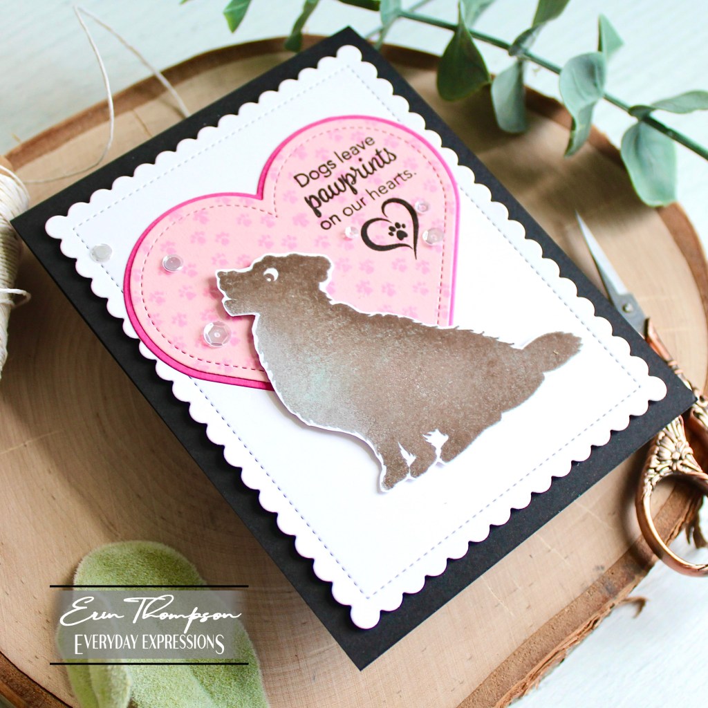I used the Master Layouts 04 die set for the layered hearts, and white background panel. Finally, I stamped the paw prints and sentiment before layering everything over a black card base, and finished with sequins.