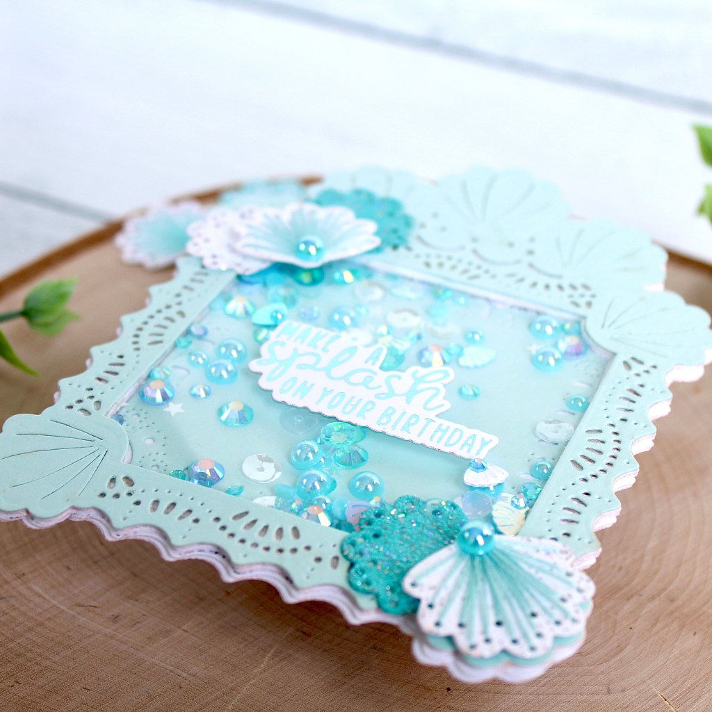This stitching die offers so many possibilities for a variety of fun cards. I decided to create a shaped shaker card, and I only stitched a few of the shells to show that you don’t have to always stitch everything. The detailing of the dies is lovely on its own.