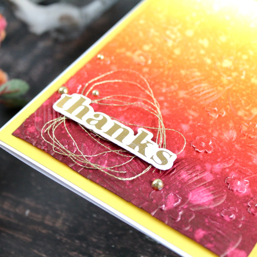 I love embossing folders for the ease in making lovely cards! I ink blended red, orange, and yellow inks on cardstock, and then dribbled and lifted water droplets. Next I ran the cardstock through the die machine in the August embossing folder. How pretty are those flowers?