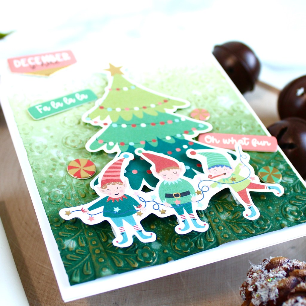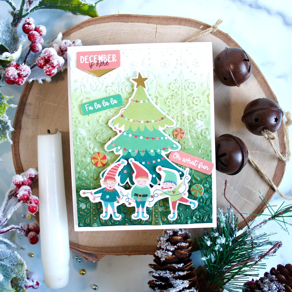 Clubs are now open to join, and there are many options including the 3D Embossing Folder of the Month. This month’s folder has a lovely Nordic feel with trees and greenery for the holidays. I ink blended three shades of green on cardstock, and then spritzed and lifted for a splattered effect.