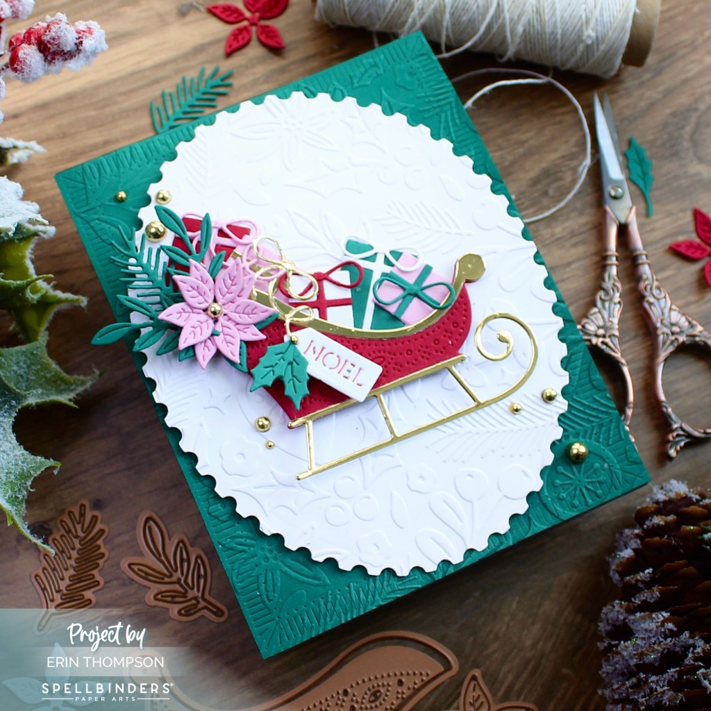 This card features the new Delivering Joy Dies from Spellbinders’ Handmade Holidays Collection. (Supplies listed below.) I used colored cardstock along with mirror gold cardstock for all of the die cuts, and paired it with die cut and embossed background layers.