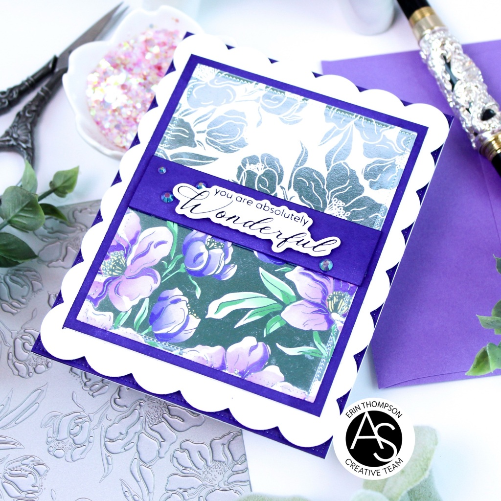 I don’t know that I can choose one favorite from this release, but it may be the Charming Florals Background press plate with layered stencils. How pretty is the ink blended floral foil paired with the foiled negative?