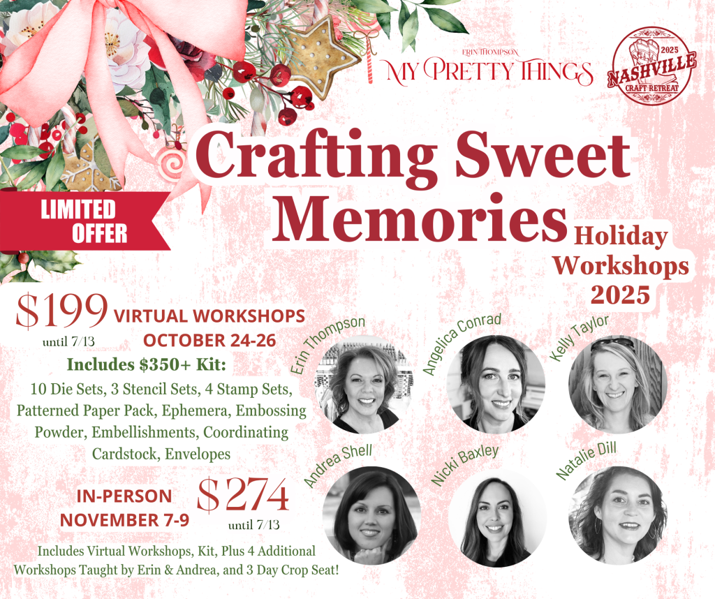Hey Friends! Have you heard the exciting news? My Pretty Things (my new craft company – more details soon) and the Nashville Craft Retreat are hosting both virtual and in-person workshops to help you with all of your holiday crafting projects!
