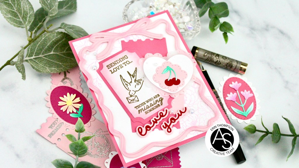 How pretty are all of the layers using several new products releasing today? I began by die cutting all of the new Love Tickets and Charming Medallions pieces in shades of pink, lavender, purple, and vellum. Then I inked the edges of the tickets, and all of the floral pieces.
