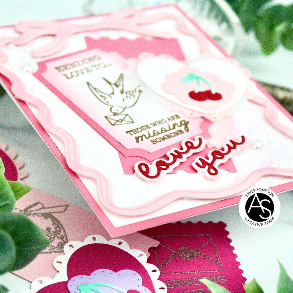 Finally, I added the die cut love you sentiments (I adore the daintiness of these), adhered everything, added a little foam to a couple pieces to pop for dimension, and added a few pearls to finish.